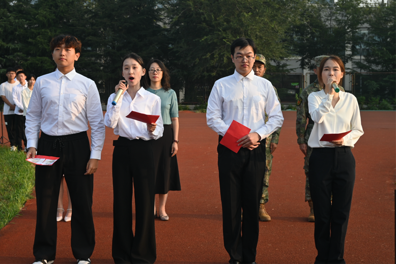 仪式最后,437bwin必赢国际2025级全体新生共同诵读《请党放心,强国有我》誓词。激昂嘹亮的诵读声回荡在操场上空,内容从致敬人民英雄、回望党的百年征程,到赞美祖国发展成就、立下青春奋斗誓言,每一句诵读都凝聚着新生们的赤诚之心,成功将仪式氛围推向高潮。